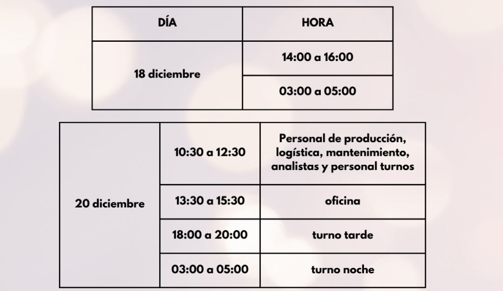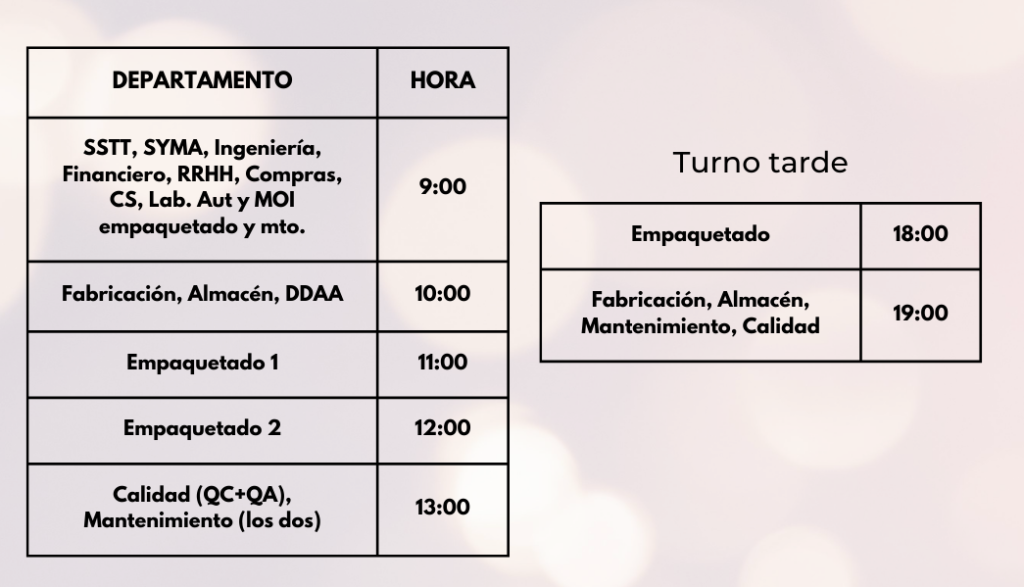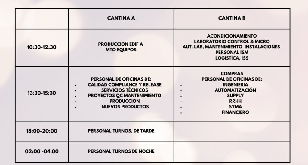 Los desayunos se servirán en la cantina de cada una de las sedes. Es importante que si tienes algún tipo de alergia o intolerancia nos lo hagas saber lo antes posible para prepararte algo perfecto para ti. Contacta con RRHH para hacérnoslo llegar.