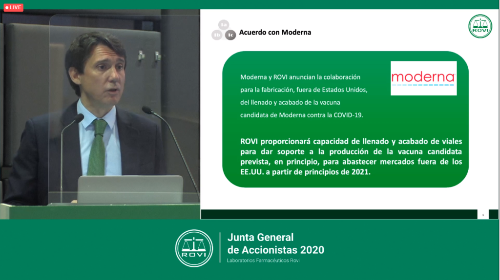 Durante la Junta General de Accionistas, la compañía ha hecho referencia también a su importante acuerdo con Moderna, para fabricar el llenado y acabado de su vacuna candidata contra la COVID-19 fuera de Estados Unidos. Asimismo, ha insistido en su apuesta continua por la Investigación como garantía de crecimiento y de sostenibilidad.