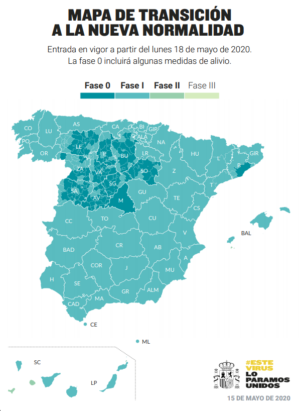 Como sabéis, el plan de desescalada del Estado de Alarma según la evolución de la pandemia de COVID-19 del Gobierno está compuesto por distintas fases que se pueden aplicar de forma desigual en el territorio español (es decir, Madrid y Granada no tienen por qué entrar en la Fase 1 en la misma fecha).